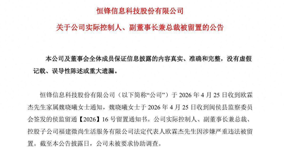 4月26日晚间,恒锋信息(300605)发布公告称,公司于4月25日收到欧霖杰先生家属魏晓曦女士通知,公司实际控制人、副董事长兼总裁、控股子公司福建微尚生活服务有限公司法定代表人欧霖杰先生因涉嫌严重违法被留置。截至本公告披露日股市策略配资,公司未被要求协助调查。