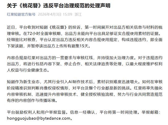 4月3日,“红果短剧官方账号”微信公众号发布声明回应此事称,已认定出品方违反相关内容合规使用规定,构成违规违约,即全面下架《桃花簪》,并暂停该出品方上传所有剧集15天。